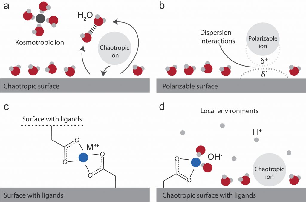 Nanoparticles with dimensions below roughly 20 nm are highly influenced by the properties of the counter-ion cloud, occupying a significant portion of the effective nanoparticle volume in aqueous dispersions.(1) The exchange between counter-ions with different properties thus substantially impacts the colloidal behavior of nanoparticles and their salt-controlled assembly into materials. Most nanocelluloses have diameters within this critical size range, and even down to a few nanometers, where the use of continuum theories, such as the DLVO theory based on the Poisson-Boltzmann theory to describe double layer repulsion and the Hamaker theory to describe van der Waals attraction, becomes at least questionable. These highly charged nano-systems are better explained by ion-ion correlation and specific ion effects (Hofmeister effects), currently the most accepted theories.(2-4)